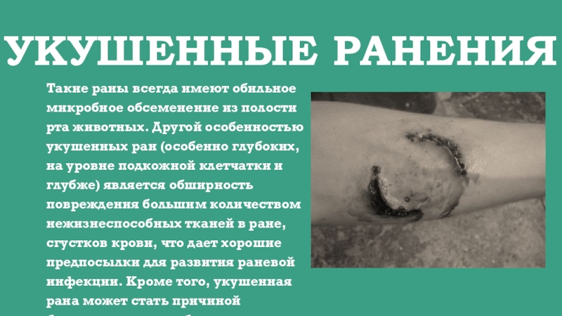 животных. Другой особенностью укушенных ран (особенно глубоких, на уровне подкожной клетчатки и глубже) является обширность повреждения большим количеством нежизнеспособных тканей в ране, сгустков крови, что дает хорошие предпосылки для развития раневой инфекции. Кроме того, укушенная рана может стать причиной бешенства или столбняка.