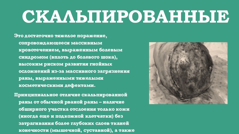 Принципиальное отличие скальпированной раны от обычной рваной раны – наличие обширного участка отслоения только кожи (иногда еще и подкожной клетчатки) без затрагивания более глубоких слоев тканей конечности (мышечной, суставной), а также внутренних органов.