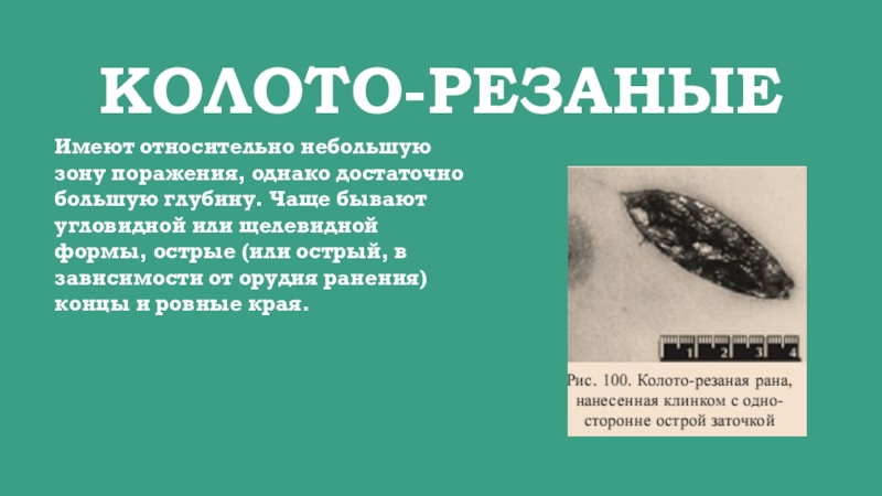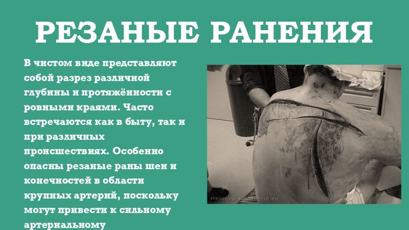 протяжённости с ровными краями. Часто встречаются как в быту, так и при различных происшествиях. Особенно опасны резаные раны шеи и конечностей в области крупных артерий, поскольку могут привести к сильному артериальному кровотечению.