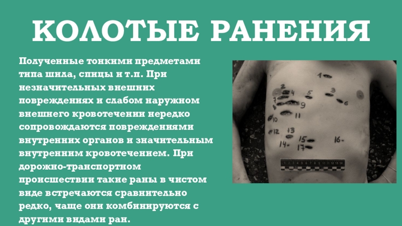 внешних повреждениях и слабом наружном внешнего кровотечении нередко сопровождаются повреждениями внутренних органов и значительным внутренним кровотечением. При дорожно-транспортном происшествии такие раны в чистом виде встречаются сравнительно редко, чаще они комбинируются с другими видами ран.