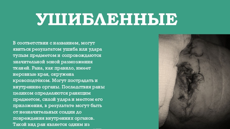 предметом и сопровождаются значительной зоной размозжения тканей. Рана, как правило, имеет неровные края, окружена кровоподтёком. Могут пострадать и внутренние органы. Последствия раны целиком определяются ранящим предметом, силой удара и местом его приложения, в результате могут быть от незначительных ссадин до повреждения внутренних органов. Такой вид ран является одним из наиболее распространенных при ДТП.
