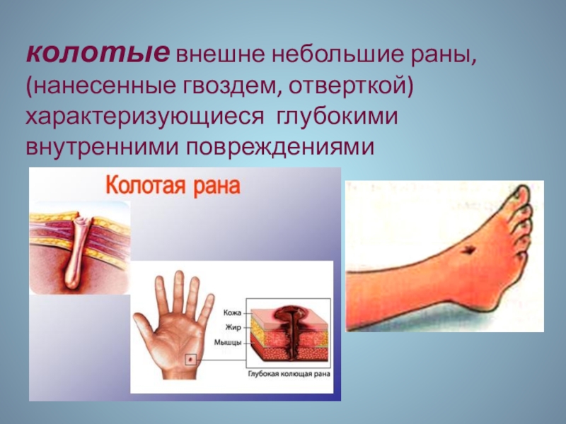 Слайд 13колотые внешне небольшие раны, (нанесенные гвоздем, отверткой) характеризующиеся глубокими внутренними повреждениями