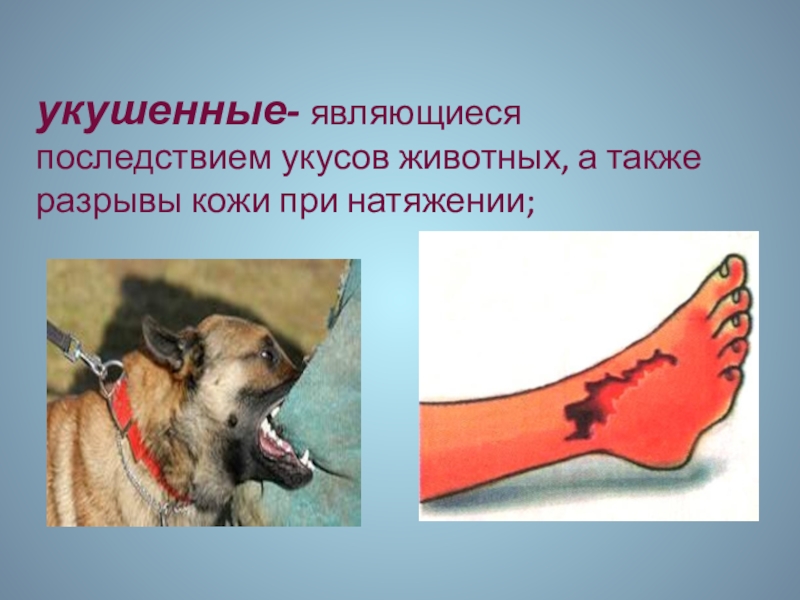 укушенные- являющиеся последствием укусов животных, а также разрывы кожи при натяжении;