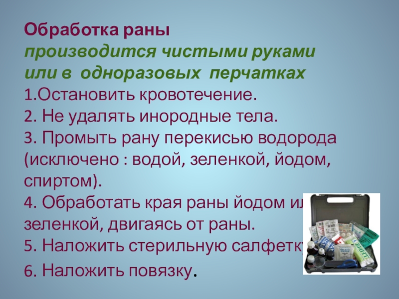 3. Промыть рану перекисью водорода (исключено : водой, зеленкой, йодом, спиртом).