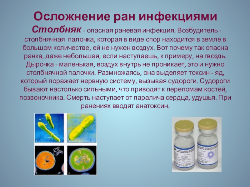 палочка, которая в виде спор находится в земле в большом количестве, ей не нужен воздух. Вот почему так опасна ранка, даже небольшая, если наступаешь, к примеру, на гвоздь. Дырочка - маленькая, воздух внутрь не проникает, это и нужно столбнячной палочки. Размножаясь, она выделяет токсин - яд, который поражает нервную систему, вызывая судороги. Судороги бывают настолько сильными, что приводят к переломам костей, позвоночника. Смерть наступает от паралича сердца, удушья. При ранениях вводят анатоксин.