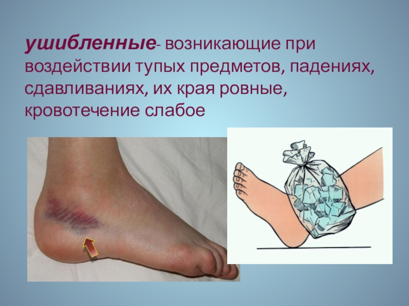 ушибленные- возникающие при воздействии тупых предметов, падениях, сдавливаниях, их края ровные,