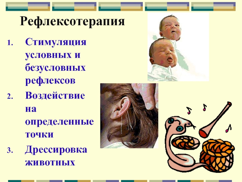 Рефлексотерапия Стимуляция условных и безусловных рефлексовВоздействие на определенные точкиДрессировка животных
