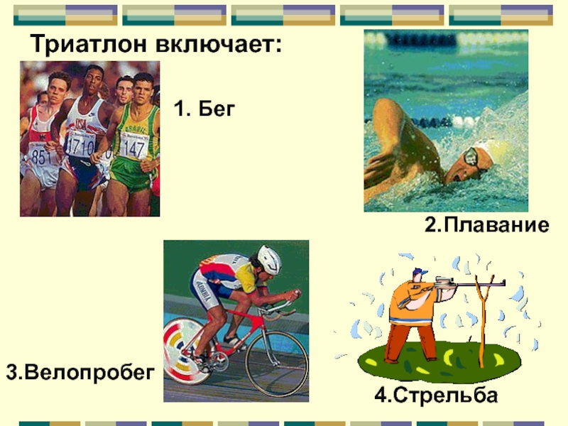 Триатлон включает:1. Бег2.Плавание3.Велопробег4.Стрельба