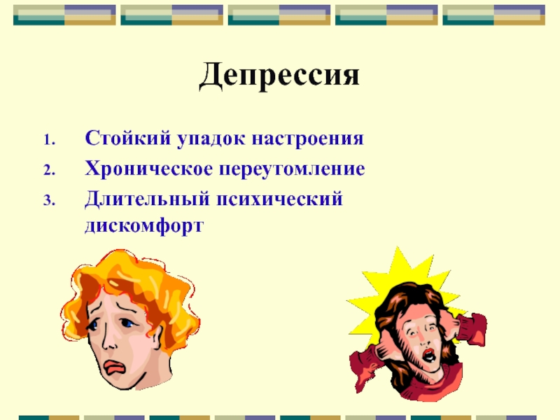 Депрессия Стойкий упадок настроенияХроническое переутомлениеДлительный психический дискомфорт