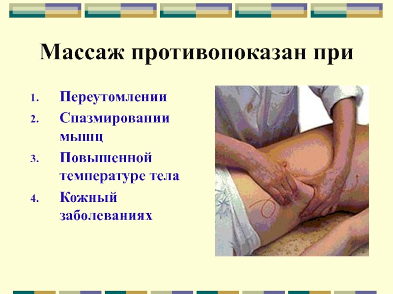 Массаж противопоказан приПереутомлении Спазмировании мышцПовышенной температуре телаКожный заболеваниях