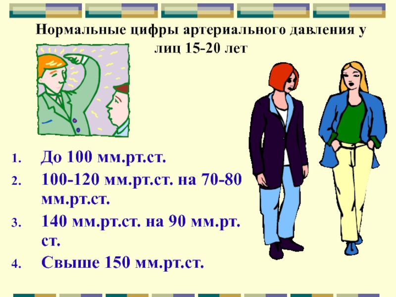 Нормальные цифры артериального давления у лиц 15-20 летДо 100 мм.рт.ст.100-120 мм.рт.ст. на 70-80 мм.рт.ст.140 мм.рт.ст. на 90