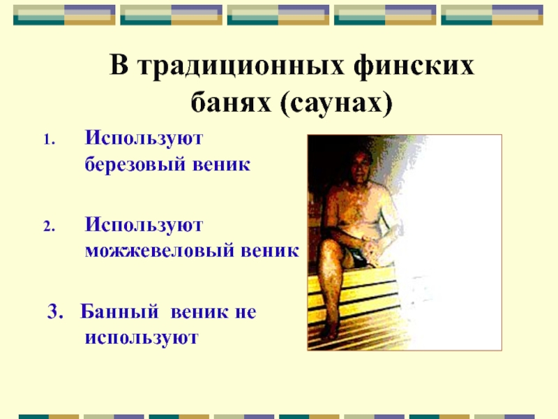 В традиционных финских банях (саунах)Используют березовый веникИспользуют можжевеловый веник3.  Банный веник не используют