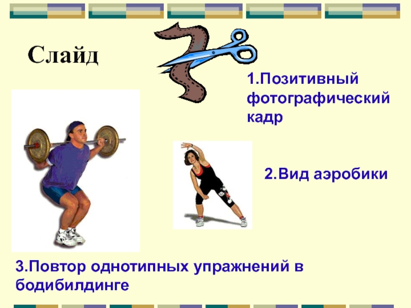 Слайд 1.Позитивный фотографический кадр3.Повтор однотипных упражнений в бодибилдинге2.Вид аэробики
