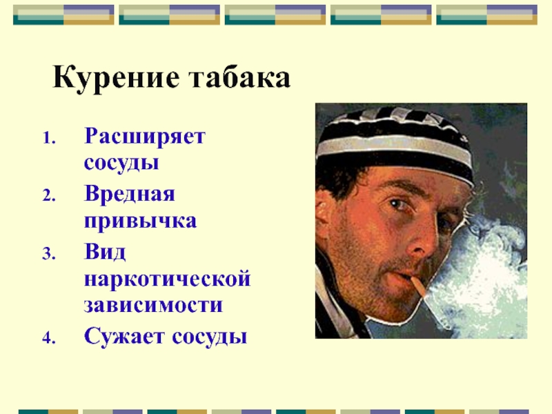 Курение табакаРасширяет сосудыВредная привычкаВид наркотической зависимостиСужает сосуды
