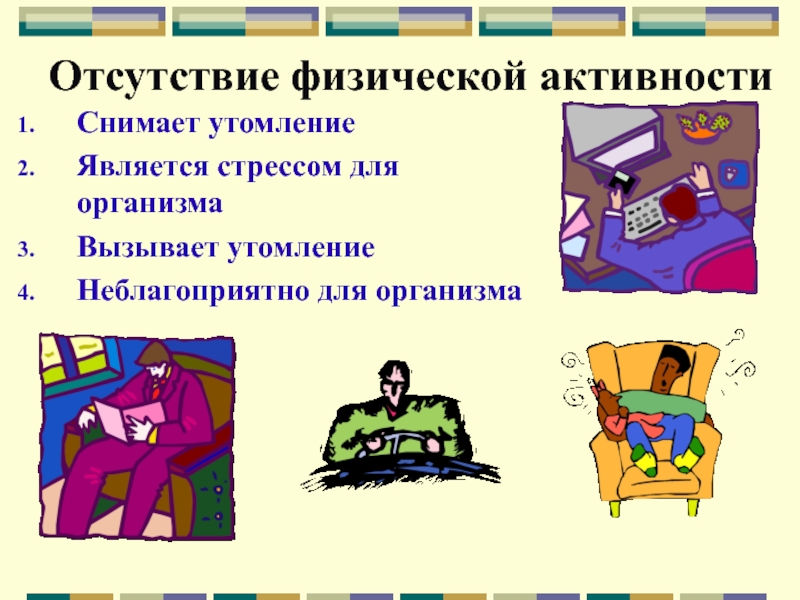 Отсутствие физической активностиСнимает утомлениеЯвляется стрессом для организмаВызывает утомлениеНеблагоприятно для организма
