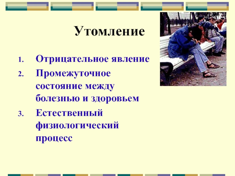 Утомление Отрицательное явлениеПромежуточное состояние между болезнью и здоровьемЕстественный физиологический процесс
