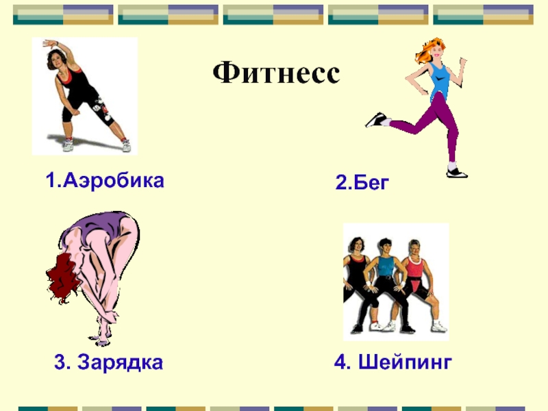 Фитнесс 1.Аэробика2.Бег3. Зарядка4. Шейпинг