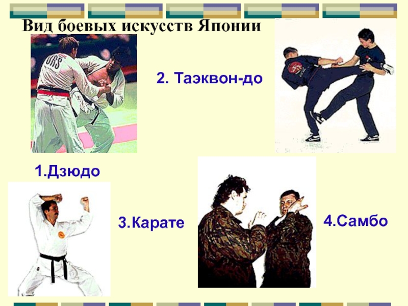 Вид боевых искусств Японии1.Дзюдо2. Таэквон-до3.Карате4.Самбо