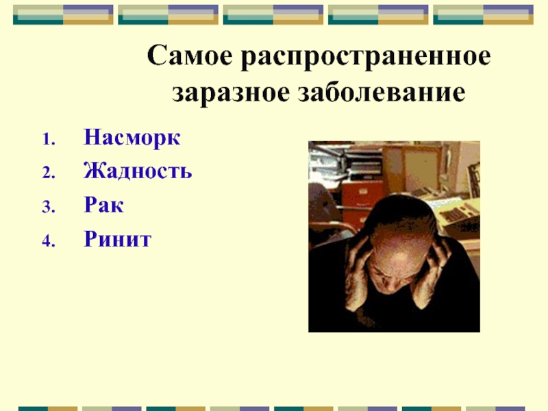 Самое распространенное заразное заболеваниеНасморк ЖадностьРакРинит