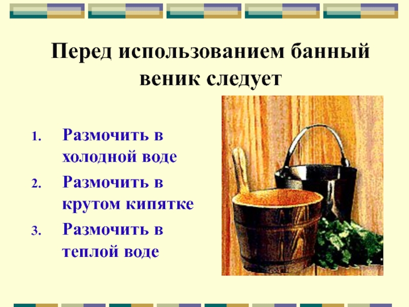 Перед использованием банный веник следуетРазмочить в холодной водеРазмочить в крутом кипяткеРазмочить в теплой воде