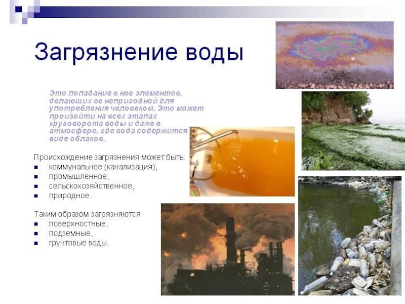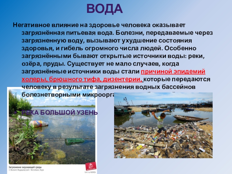 через загрязненную воду, вызывают ухудшение состояния здоровья, и гибель огромного числа людей. Особенно загрязнёнными бывают открытые источники воды: реки, озёра, пруды. Существует не мало случаев, когда загрязнённые источники воды стали причиной эпидемий холеры, брюшного тифа, дизентерии, которые передаются человеку в результате загрязнения водных бассейнов болезнетворными микроорганизмов и бактерий.