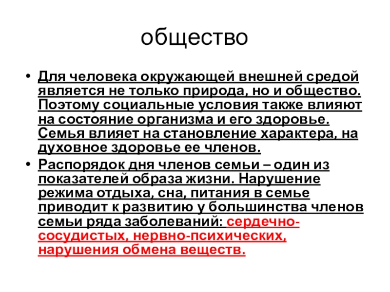 общество. Поэтому социальные условия также влияют на состояние организма и его здоровье. Семья влияет на становление характера, на духовное здоровье ее членов.