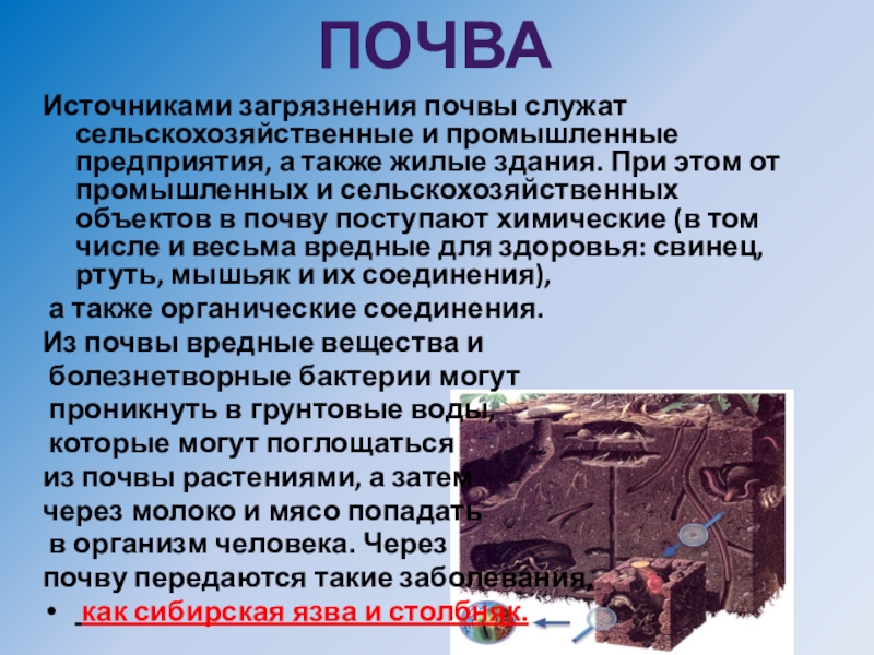 Источниками загрязнения почвы служат сельскохозяйственные и промышленные предприятия, а также жилые