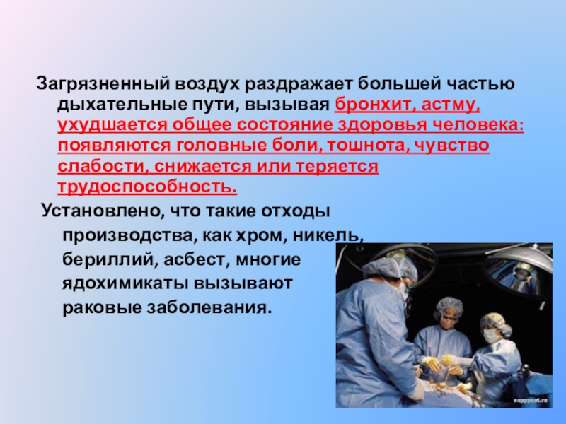 Слайд 5Загрязненный воздух раздражает большей частью дыхательные пути, вызывая бронхит, астму, ухудшается