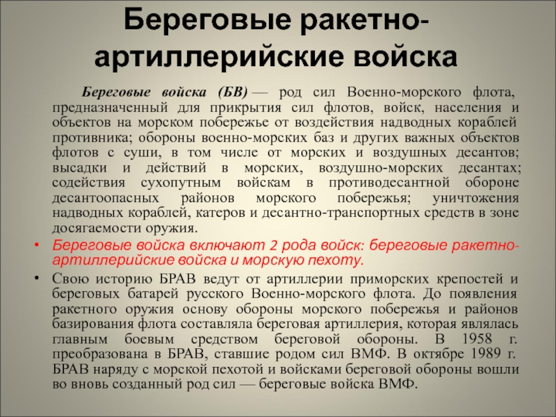 флота, предназначенный для прикрытия сил флотов, войск, населения и объектов на морском побережье от воздействия надводных кораблей противника; обороны военно-морских баз и других важных объектов флотов с суши, в том числе от морских и воздушных десантов; высадки и действий в морских, воздушно-морских десантах; содействия сухопутным войскам в противодесантной обороне десантоопасных районов морского побережья; уничтожения надводных кораблей, катеров и десантно-транспортных средств в зоне досягаемости оружия.