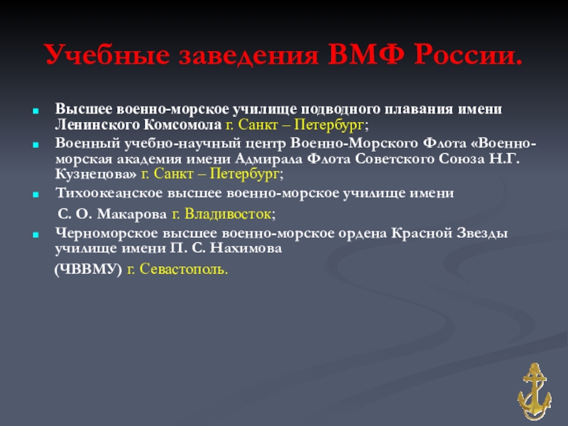 Военный учебно-научный центр Военно-Морского Флота «Военно-морская академия имени Адмирала Флота Советского Союза Н.Г. Кузнецова» г. Санкт – Петербург;