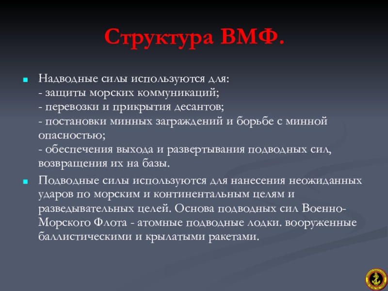 В состав ВМФ входят также корабли и суда, части специального назначения, части и подразделения тыла.