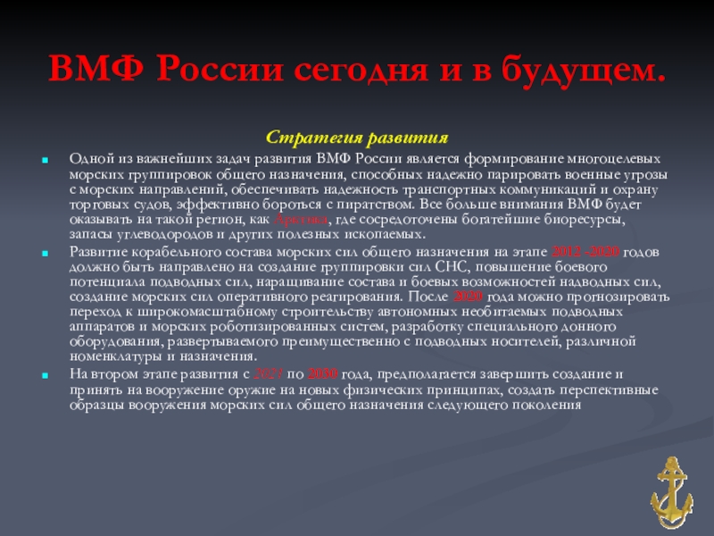ВМФ России является формирование многоцелевых морских группировок общего назначения, способных надежно парировать военные угрозы с морских направлений, обеспечивать надежность транспортных коммуникаций и охрану торговых судов, эффективно бороться с пиратством. Все больше внимания ВМФ будет оказывать на такой регион, как Арктика, где сосредоточены богатейшие биоресурсы, запасы углеводородов и других полезных ископаемых.