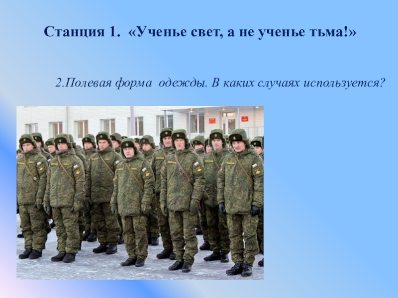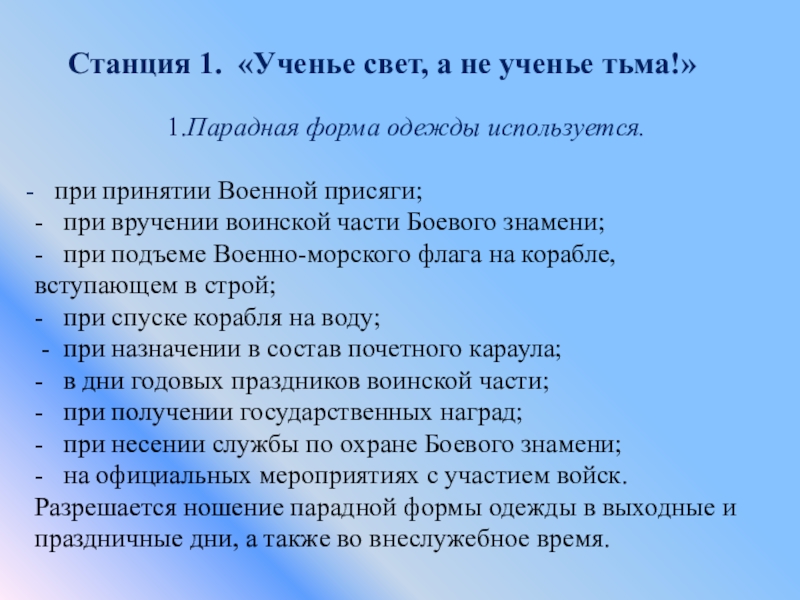 — в суточных нарядах (кроме военнослужащих, проходящих службу по контракту, дежурящих в штабах, управлениях и учреждениях), на учении, маневрах, боевых дежурствах и занятиях в учебных центрах.