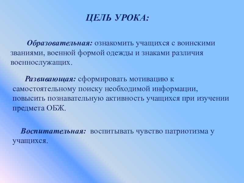 Развивающая: сформировать мотивацию к самостоятельному поиску необходимой информации, повысить познавательную активность учащихся при изучении предмета ОБЖ.