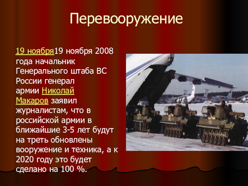 Перевооружение  19 ноября19 ноября 2008 года начальник Генерального штаба ВС России генерал армии Николай Макаров заявил журналистам, что в