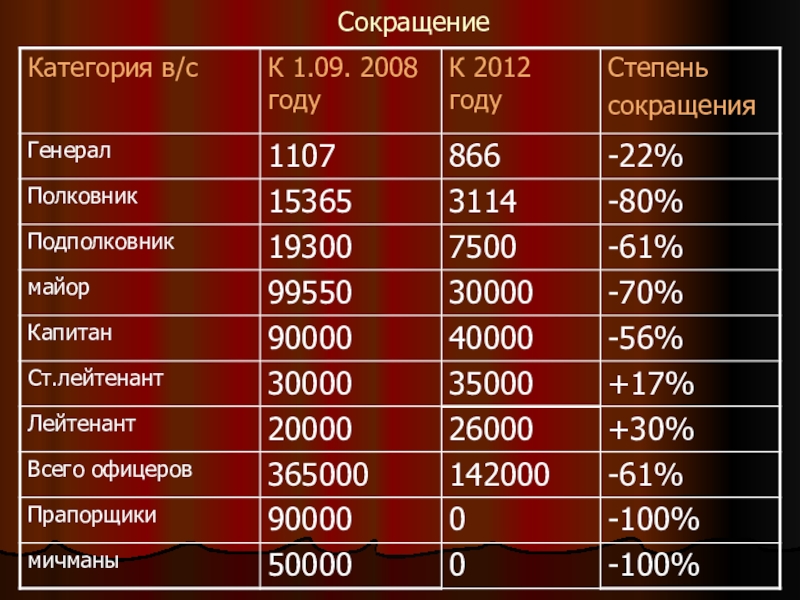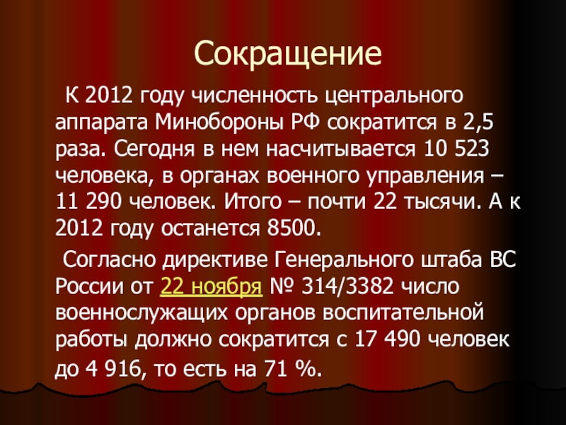 Сокращение  К 2012 году численность центрального аппарата Минобороны РФ сократится в 2,5 раза. Сегодня в нем
