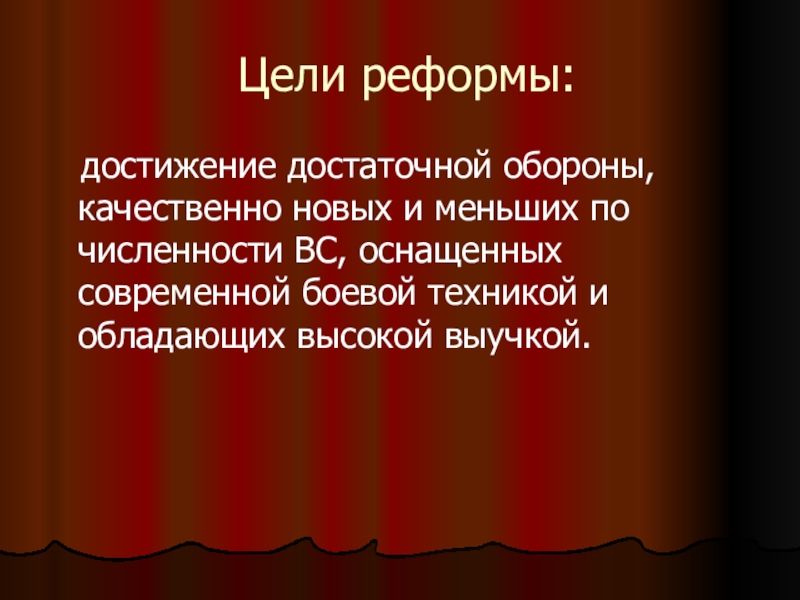 Цели реформы: достижение достаточной обороны, качественно новых и меньших по численности ВС, оснащенных современной боевой техникой и обладающих высокой выучкой.