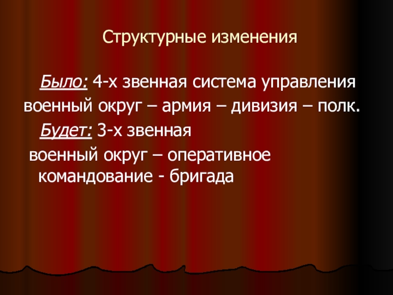 Структурные изменения  Было: 4-х звенная система управлениявоенный округ – армия – дивизия – полк.  Будет: