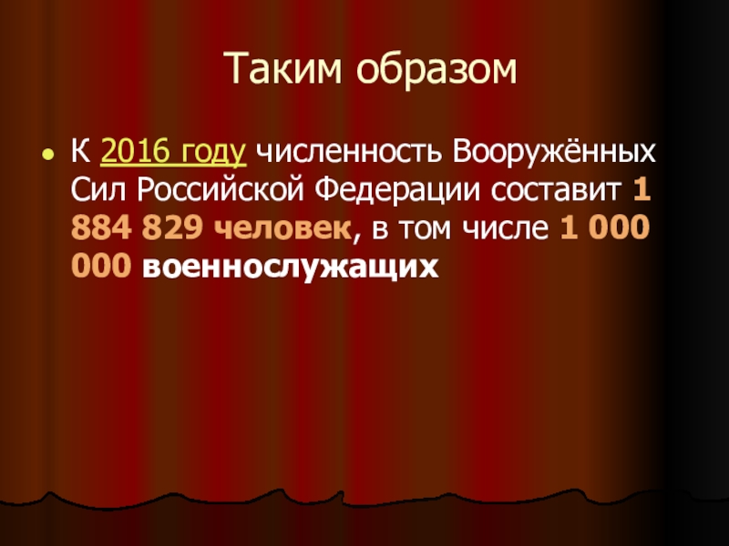 Таким образомК 2016 году численность Вооружённых Сил Российской Федерации составит 1 884 829 человек, в том числе 1 000 000 военнослужащих