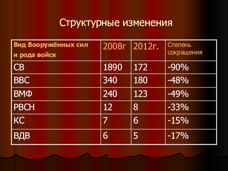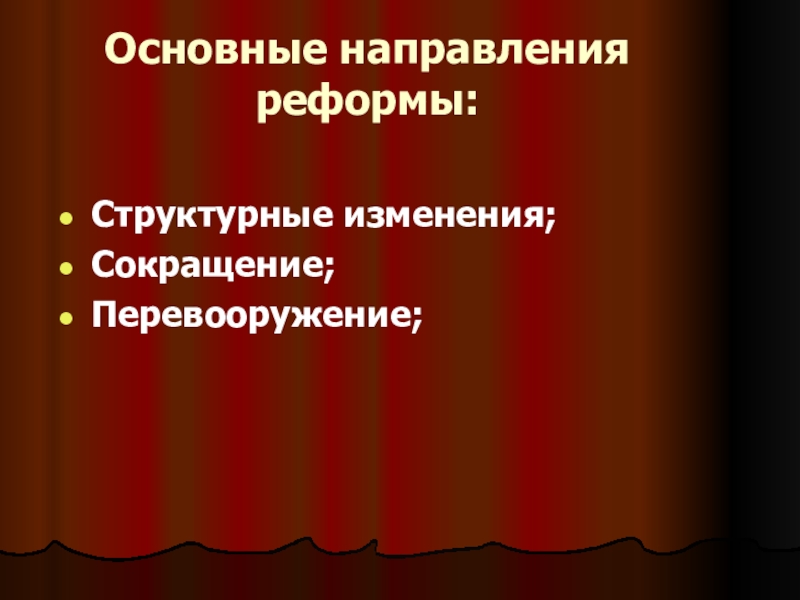 Основные направления реформы: Структурные изменения;Сокращение;Перевооружение;