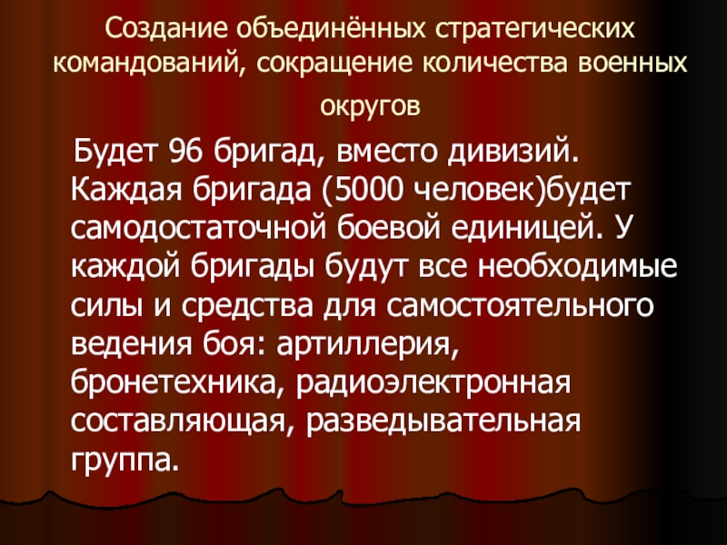 Создание объединённых стратегических командований, сокращение количества военных округов  Будет 96 бригад, вместо дивизий. Каждая бригада (5000