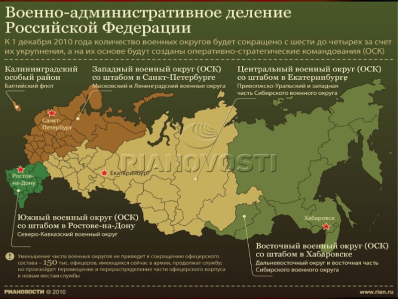 Слайд 14Создание объединённых стратегических командований, сокращение количества военных округов