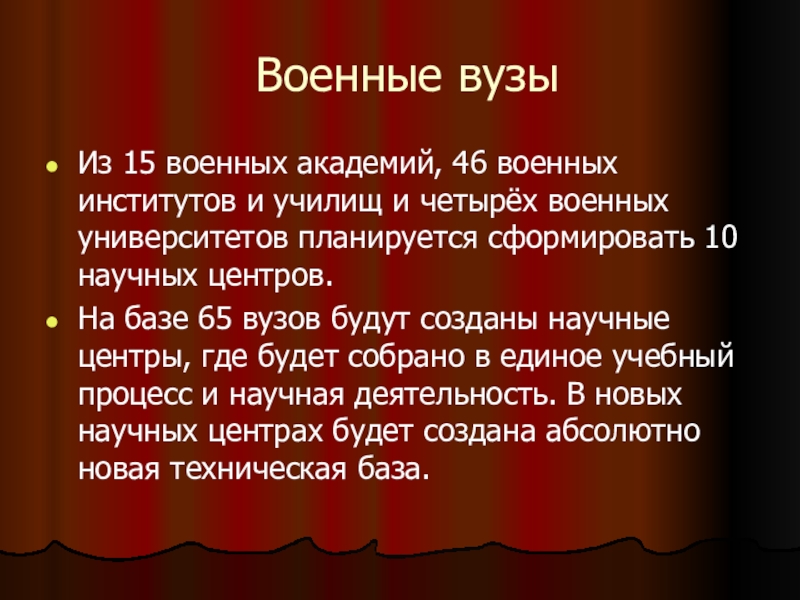 Военные вузы Из 15 военных академий, 46 военных институтов и училищ и четырёх военных университетов планируется сформировать