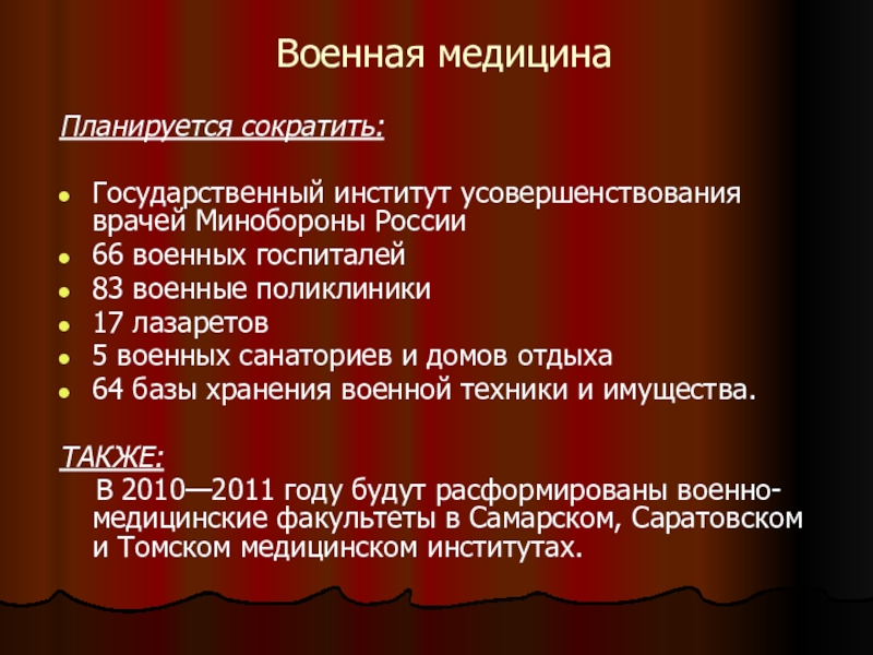Военная медицина Планируется сократить:Государственный институт усовершенствования врачей Минобороны России66 военных госпиталей83 военные поликлиники17 лазаретов5 военных санаториев и