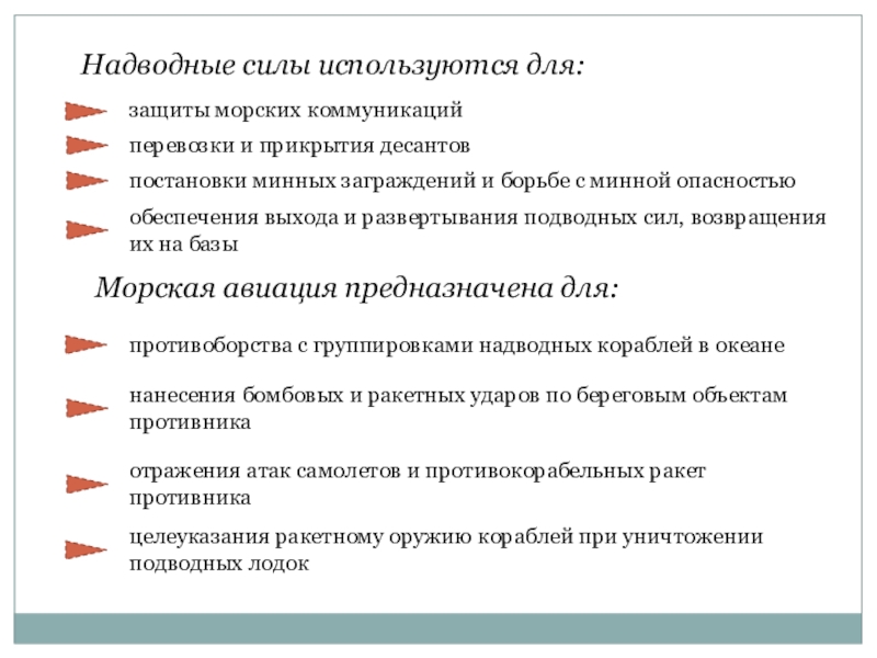 Надводные силы используются для:защиты морских коммуникацийперевозки и прикрытия десантовпостановки минных заграждений и борьбе с минной опасностьюобеспечения выхода
