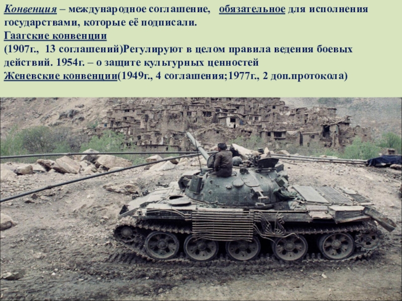 Конвенция – международное соглашение,  обязательное для исполнения  государствами, которые её подписали.Гаагские конвенции(1907г., 13 соглашений)Регулируют в