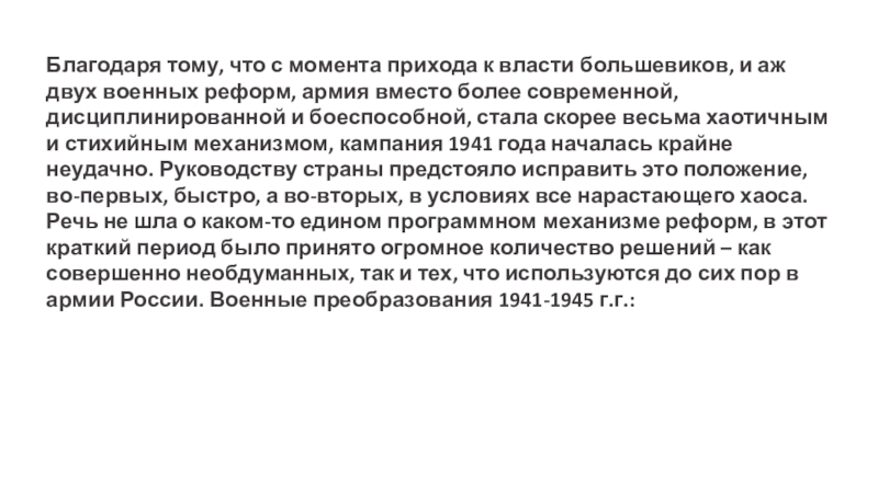двух военных реформ, армия вместо более современной, дисциплинированной и боеспособной, стала скорее весьма хаотичным и стихийным механизмом, кампания 1941 года началась крайне неудачно. Руководству страны предстояло исправить это положение, во-первых, быстро, а во-вторых, в условиях все нарастающего хаоса. Речь не шла о каком-то едином программном механизме реформ, в этот краткий период было принято огромное количество решений – как совершенно необдуманных, так и тех, что используются до сих пор в армии России. Военные преобразования 1941-1945 г.г.: