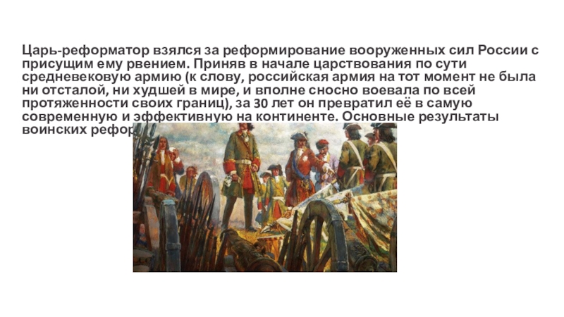Приняв в начале царствования по сути средневековую армию (к слову, российская армия на тот момент не была ни отсталой, ни худшей в мире, и вполне сносно воевала по всей протяженности своих границ), за 30 лет он превратил её в самую современную и эффективную на континенте. Основные результаты воинских реформ Петра I: