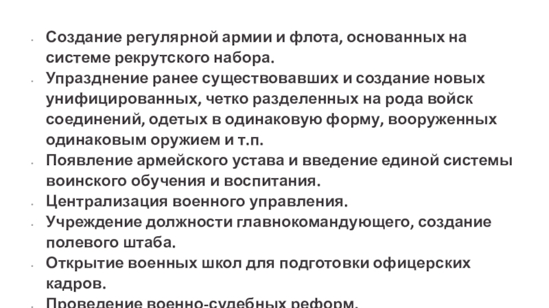 Слайд 15Создание регулярной армии и флота, основанных на системе рекрутского набора.