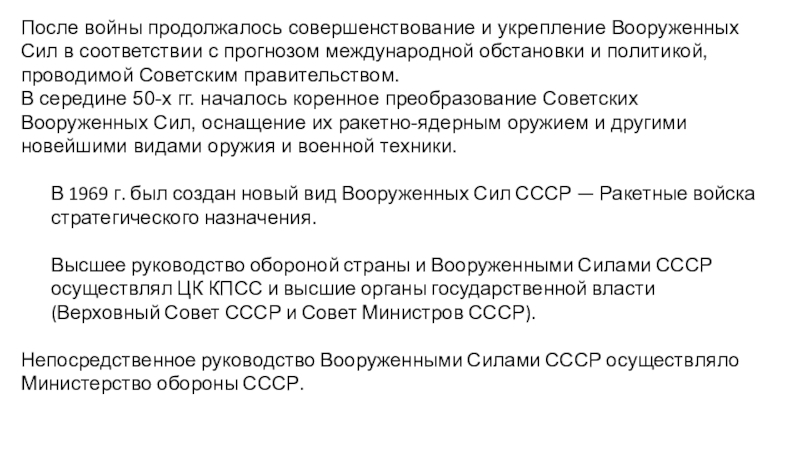 Слайд 43После войны продолжалось совершенствование и укрепление Вооруженных Сил в соответствии с